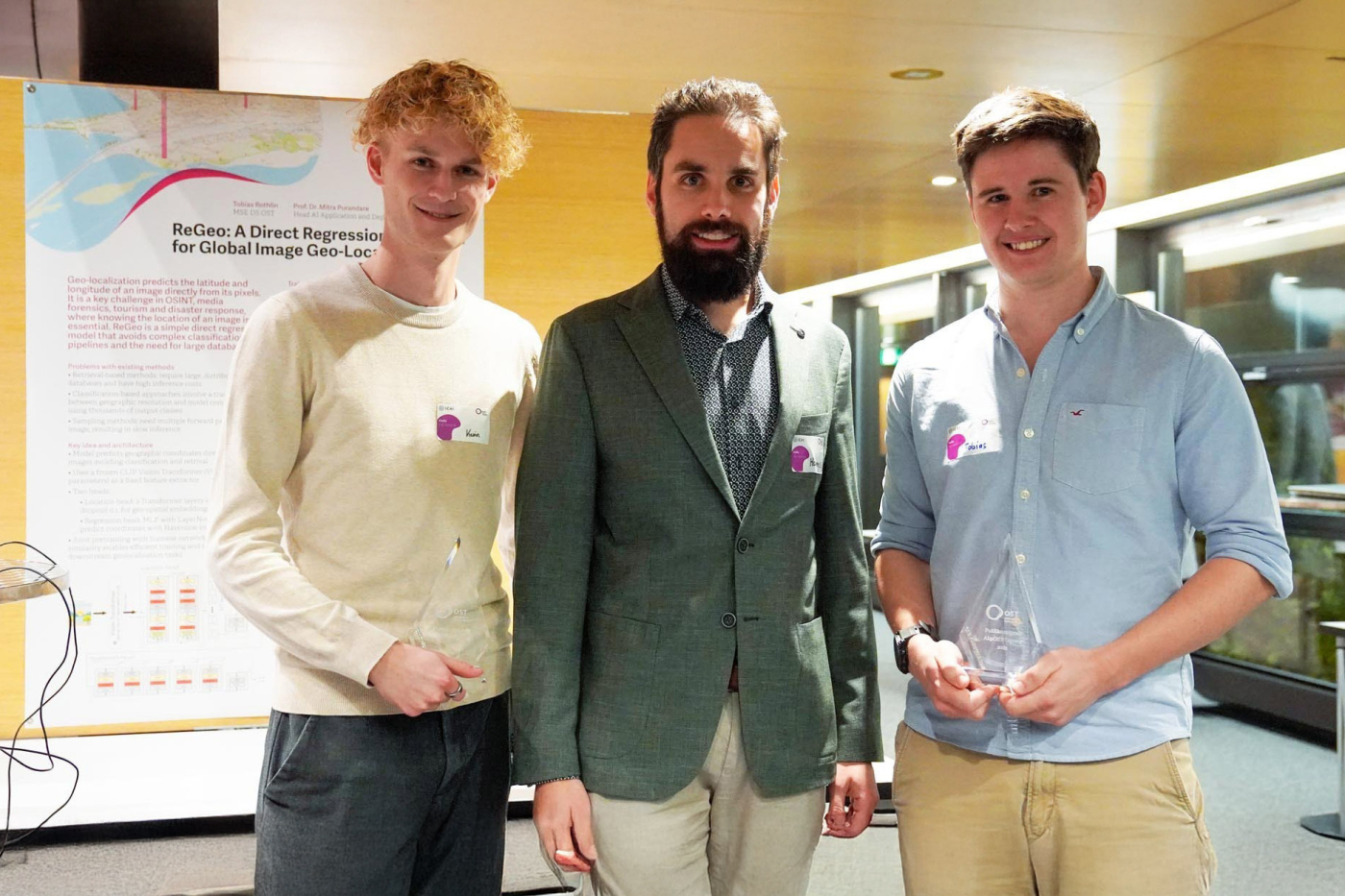 An der «AI@OST-Tagung» 2025 beeindruckte das studentische KI-Projekt «ReGeo». Tobias Rothlin entwickelte ein regressionsbasiertes Modell zur Geolokalisierung von Bildern, das Breiten- und Längengrade aus Pixeldaten vorhersagen kann, betreut von Prof. Dr. Mitra Purandare am IFS der OST. Kevin Löffler unterstützte das Projekt mit einer Web-App, in die Nutzer die KI testen können. Dafür gewann das Team den Publikumspreis als bestes KI-Projekt des Jahres.